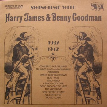 Vamos con el álbum en cuestión. Al contrario de lo que pueda parecer, Harry James y Benny Goodman no actúan en conjunto, sino que cada uno ocupa una cara del disco. Por lo demás, el resto de la portada proporciona casi toda la información sobre lo que nos encontraremos dentro... excepto el dibujo en sí. Que levanten la mano los que sepan identificar el contenido con dos bomberos -a modo de querubines con sus cornetas, eso sí- subidos con la manguera a una escalera. Aparte de poder jugar a buscar las 7 diferencias entre ambos, siempre desconcierta mirarla. Quizás se trate de apagar o calmar la celeridad de su interior, o tal vez estos desajustes se expliquen al ver que el responsable del diseño es Sergio Balloni, el propio director de la colección (Archive of Jazz - Recordings of the Jazz History) y aunque sólo tres discos de la misma disponen de dibujos en vez del montaje fotográfico habitual, en éste Balloni se sale por completo de la norma. Mas el color castaño del cartón es un acierto; le imprime un carácter retro distintivo.